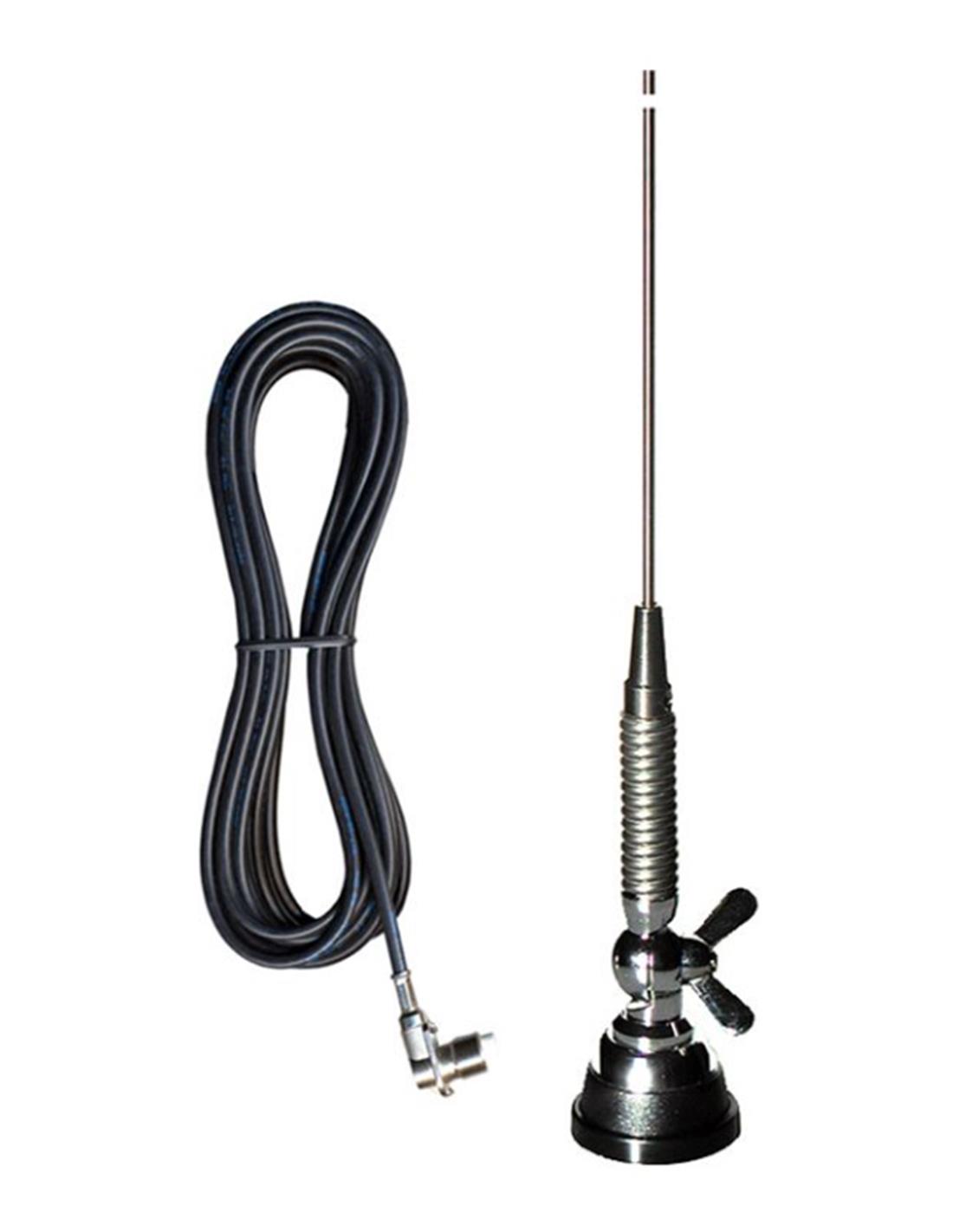 Antena móvil VHF-UHF MGA 108-550S, radiante en acero inoxidable con muelle en la parte inferior. 1/4 de onda ajustable entre 108 y 550 MHz. La antena se suministra completa con Base S y 5 m de cable RG-58. (Ver diagrama de corte en el manual adjunto más abajo.)