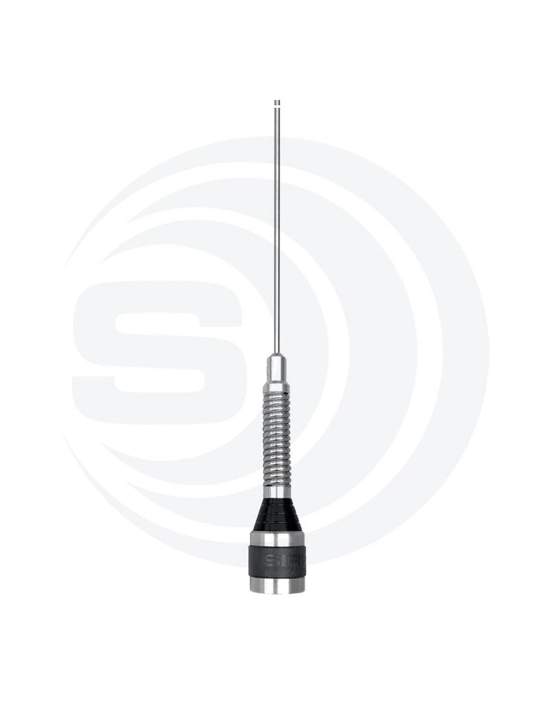 Radiante PL para VHF o UHF. Rango 136-550 MHz ajustando mediante corte. Ajuste de origen, centro de banda 144 MHz. Muelle de alta calidad. Terminación PL Macho (PL259). Ancho de banda >15 MHz. (VHF) Potencia máxima recomendable 200W. Compatible Ham Radio y PMR Comercial. Color Plata.