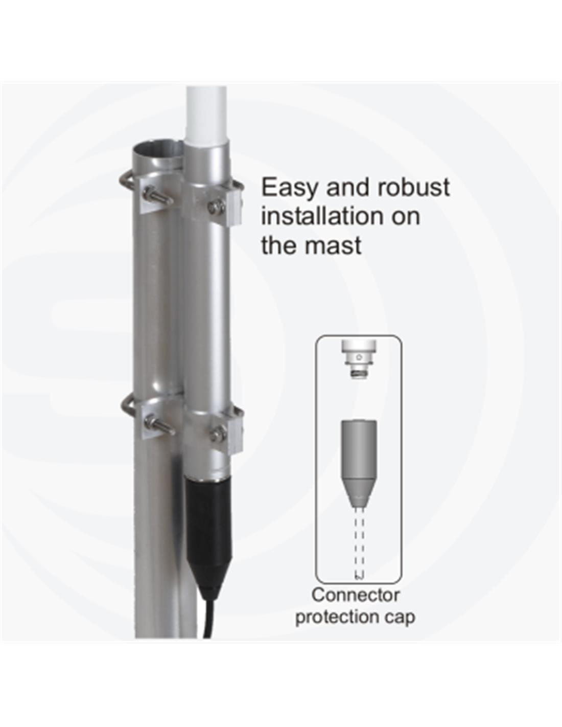 Antena base omnidireccional UHF, muy robusta. ROE < 1.5 en extremos de banda. No precisa ningún tipo de ajuste. Especial aplicaciones PMR UHF & LoRa, ISM 433 MHz - Telemando & Telemetría. Rango 380 - 470 MHz. Encapsulada en fibra de vidrio de alta calidad con protección Ultra Violeta. Sección encapsulado Ø 28.6 mm. Conector N Hembra (HQ) en la base. La parte inferior de la antena está fabricada en aluminio anodizado 6063-T5 para garantizar su robustez y durabilidad. Por protección, todas las partes metálicas están cortocircuitadas a masa. Potencia máxima 75 W. Cada antena se suministra con su soporte a mástil y con herrajes de acero inoxidable. Todas las antenas de la serie incluyen Capuchón de caucho Protector EPDM para conector N .