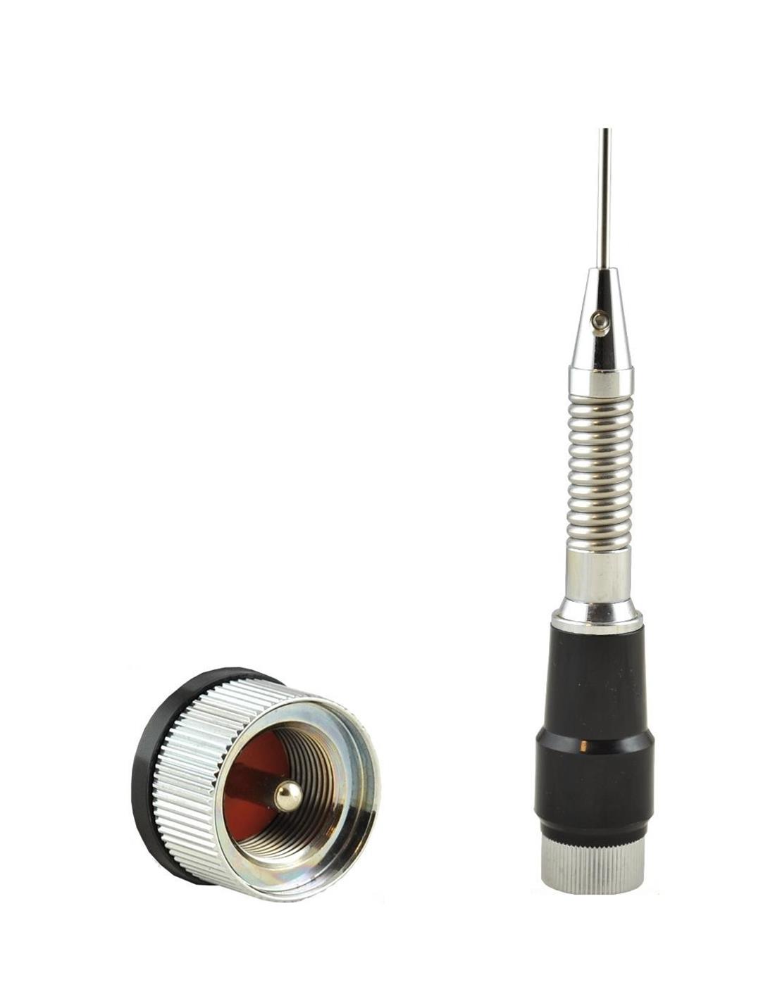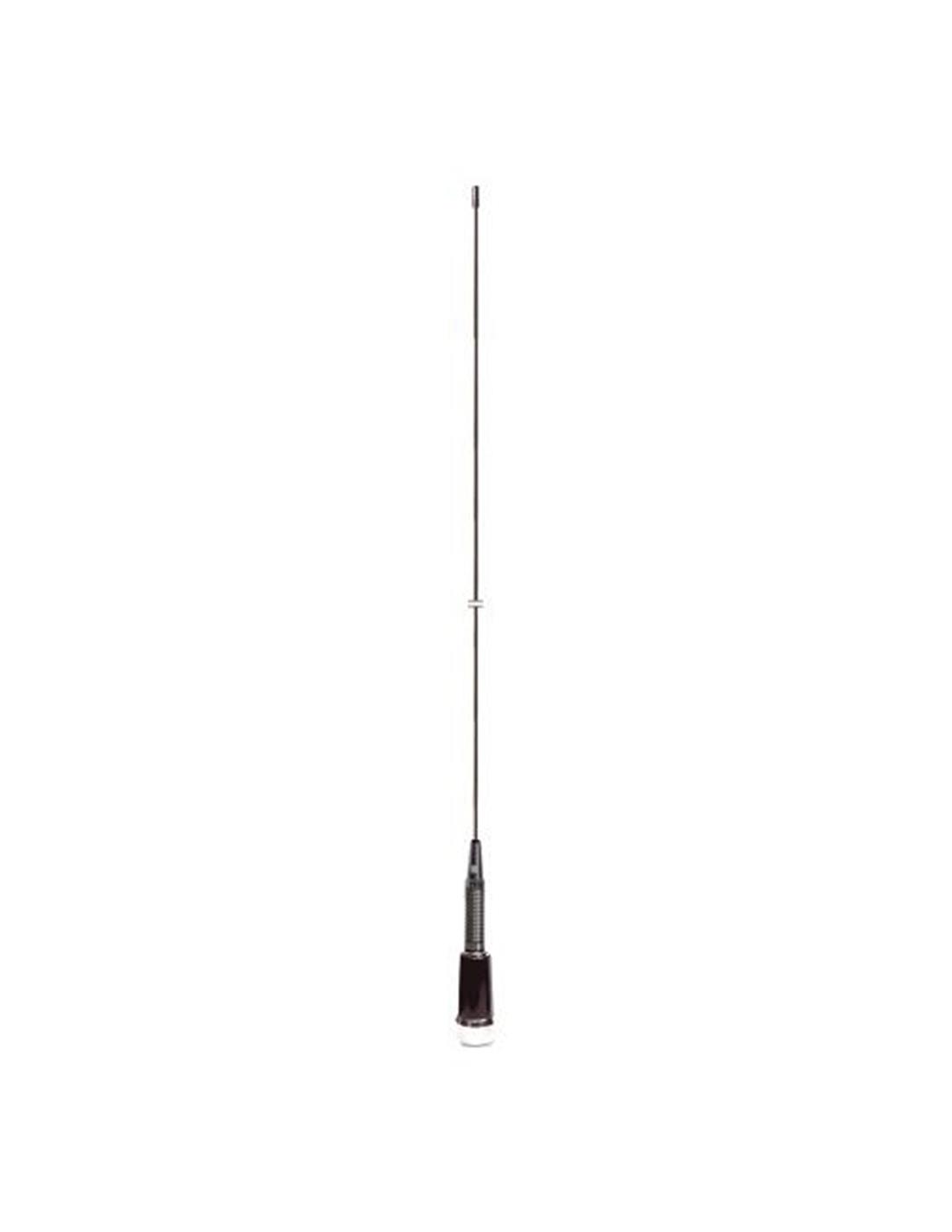 Antena móvil VHF con muelle y rosca PLTipo: 5/8Frecuencia: 144-174 MHz.Ganancia: 3.4 dBi.Potencia máxima: 200 W.Longitud: 1,33 m.