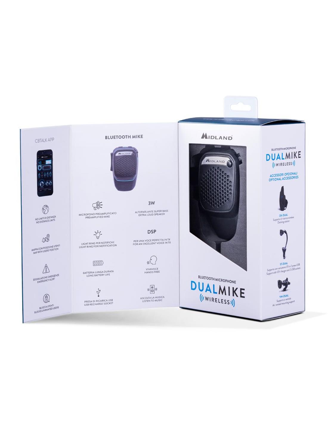 · Dual Mike se conecta a la emisora CB a través de una conexión de 4 pin y al smartphone a través de Bluetooth. Gracias a la APP CBTalk podrás ajustar la distancia (0-30 km) y los canales (40), seleccionar el idioma y ver el mapa con indicaciones de otros usuarios cercanos, con fotos o avatares, nombres y el idioma hablado. Con lo que combina los mundos analógico y digital.