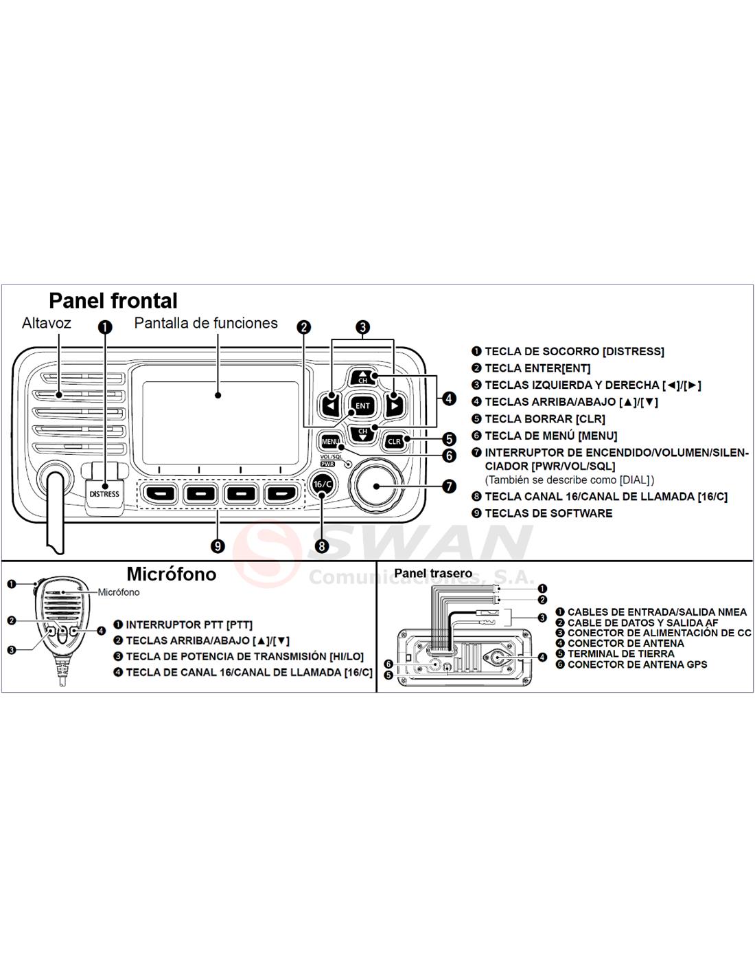 - Funciones DSC incluidas: socorro, individual, grupo, todos los barcos, urgencia, seguridad, solicitud de posición/informe, solicitud de sondeo y llamadas de prueba DSC.