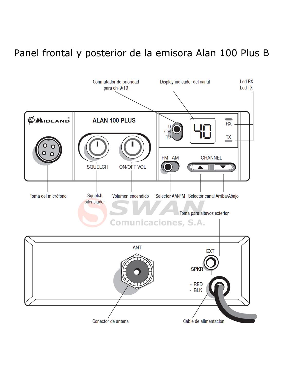 La emisora Alan 100 Plus B tiene un tamaño compacto. Destaca por ser un equipo sencillo y fácil de manejar pero con todas las funciones básicas necesarias de banda ciudadana. Con pantalla de dos dígitos para visualizar el canal y conector para el micrófono de 4 pin.