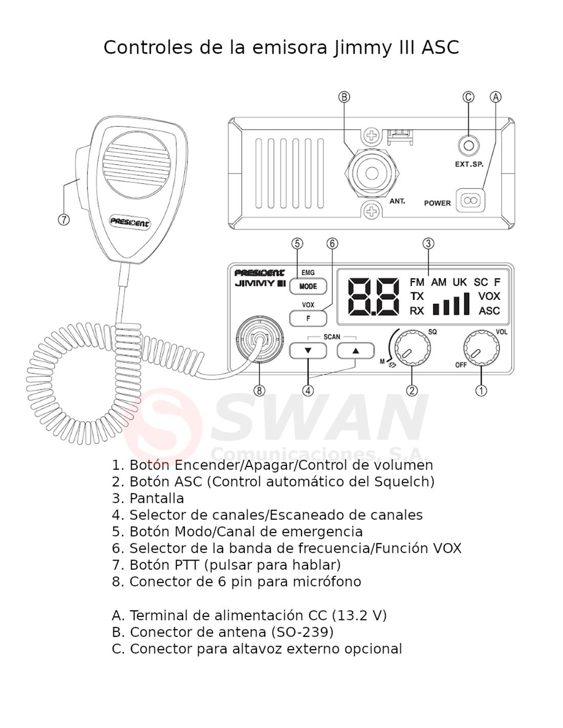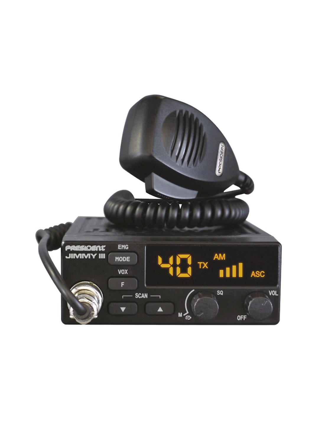La emisora de banda ciudadana Jimmy III dispone de Squelch manual y automático, pantalla LCD multifunción en la que muestra información relevante como la frecuencia y el canal actual, 2 canales dedicados para situaciones de emergencia (EMG), 40 canales AM/FM, función VOX y TOT.