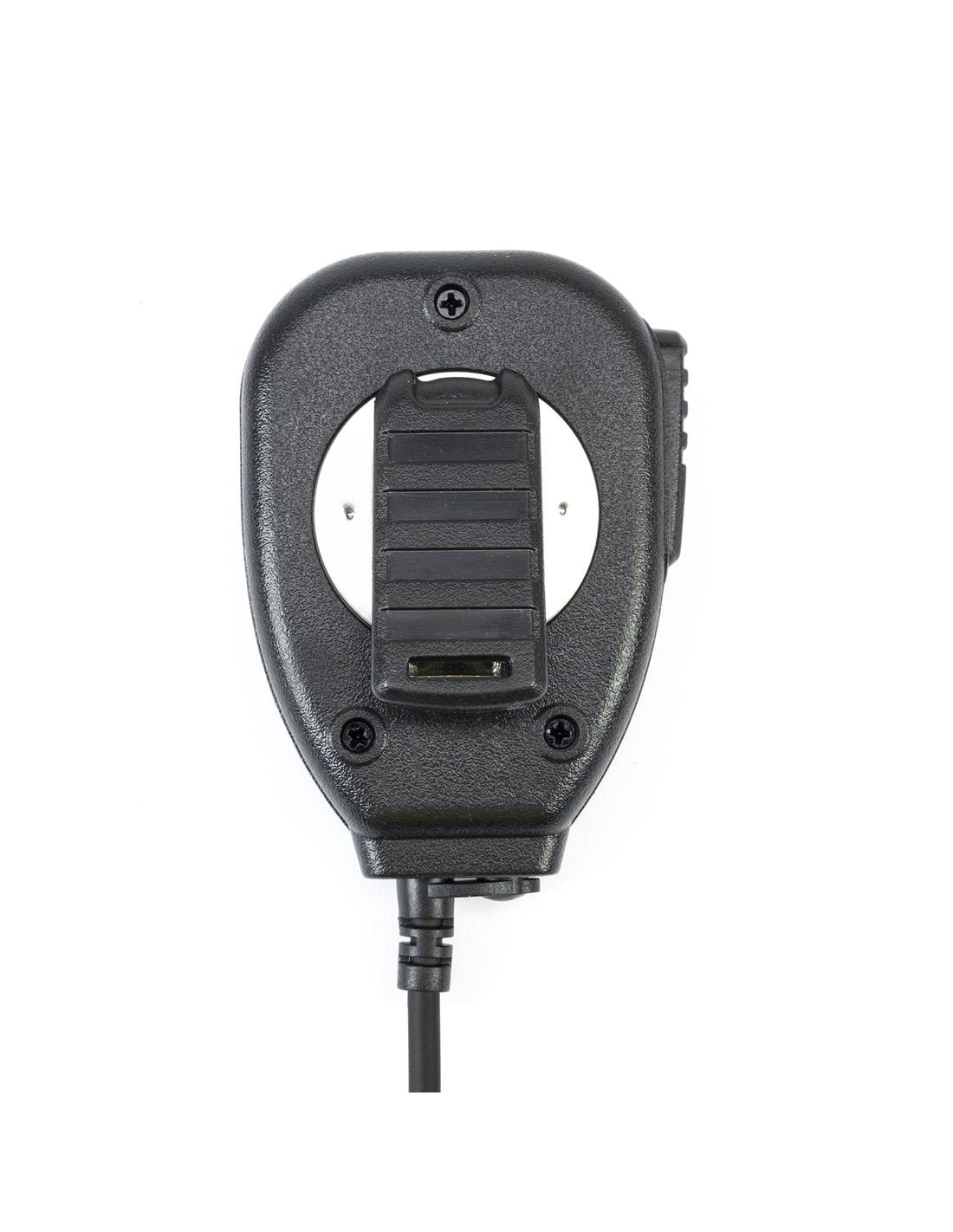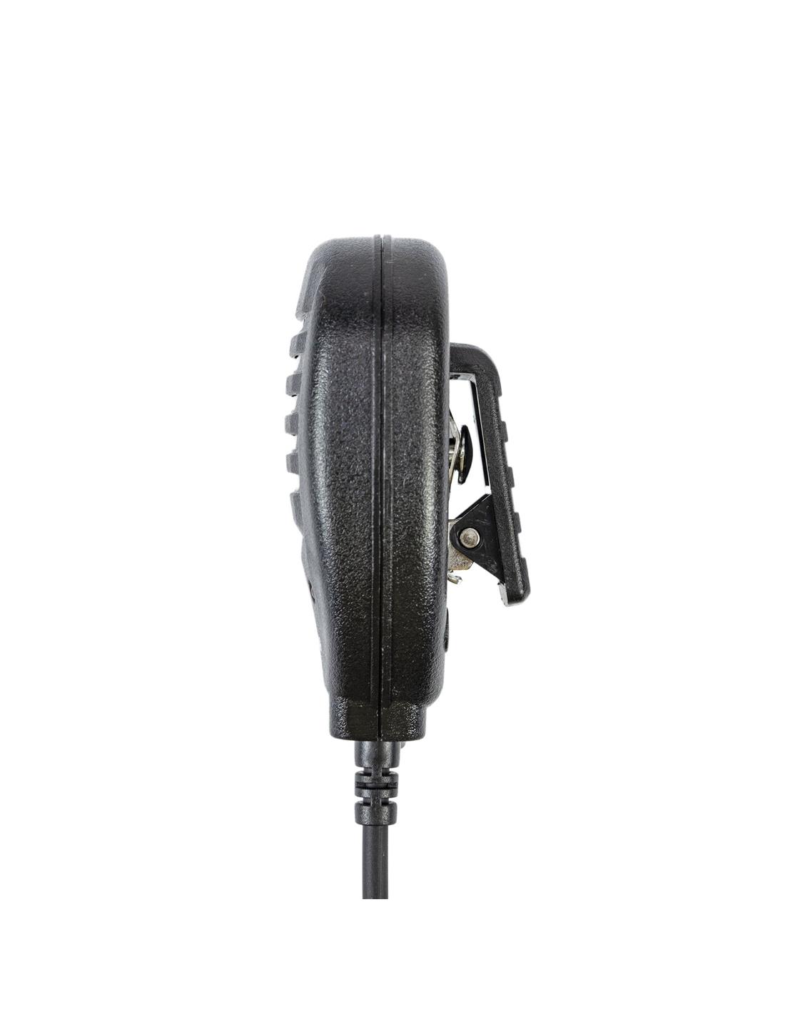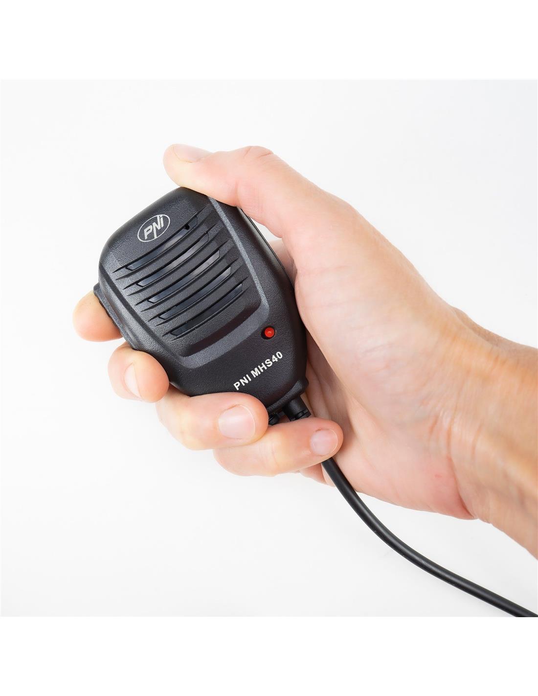 El micrófono PNI MHS40, además del altavoz integrado, permite conectar un altavoz externo a través del conector en la parte inferior. El indicador luminoso rojo se enciende al transmitir pulsando la tecla PTT.
