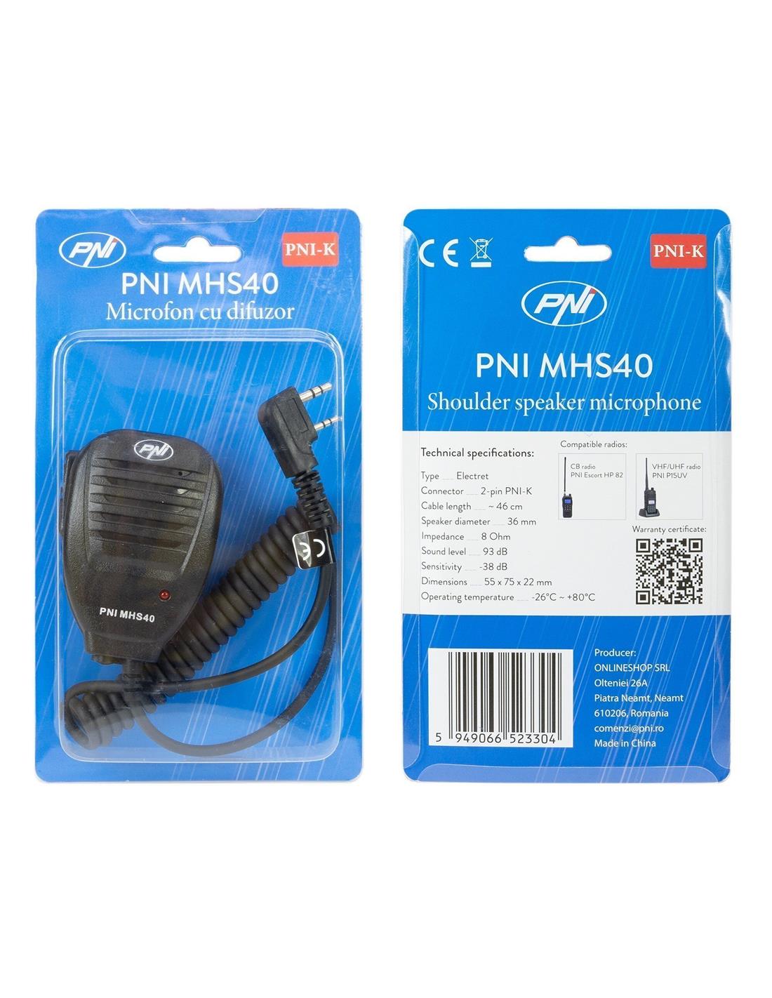 El micrófono PNI MHS40 es compatible con radios portátiles PMR o VHF/UHF de doble banda equipadas con una toma de accesorios externa PNI-K (Kenwood) de 2 pines.