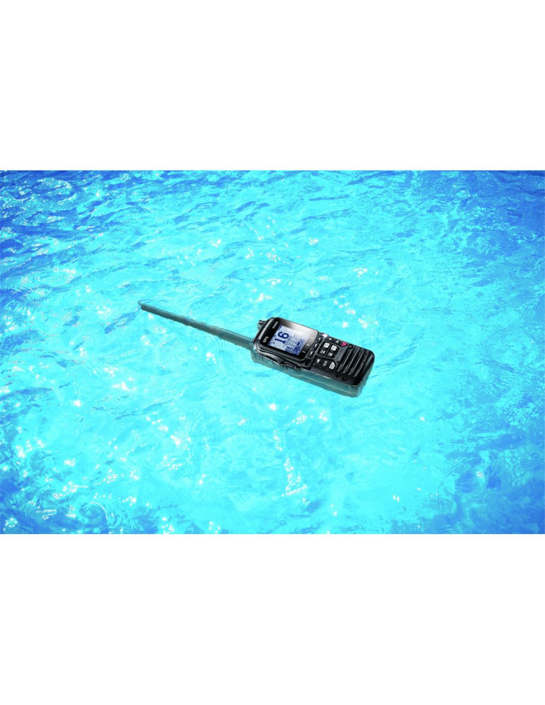 El walkie HX890E es un equipo muy robusto y resistente, cumple con el grado de protección IPX8 y con las normas MIL STD810-F. Equipo flotante y dispone de luz estroboscópica de emergencia que se enciende automáticamente en caso de caer al agua, incluso cuando el equipo está apagado.