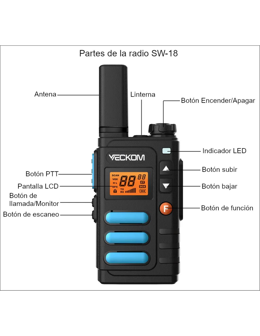 El walkie VECKOM SW-18 tiene la carcasa de policarbonato y el chasis de aluminio fundido a presión. Cumple con el grado de protección IP54 y está construido para una mayor protección, ofreciendo un rendimiento fiable en condiciones climáticas y ambientales severas. La salida de potencia de audio de 1000 mW y el diseño único de la estructura de la caja de audio hacen que el SW-18 proporcione una calidad de voz excepcional, puede eliminar por completo el ruido de fondo y la estática de las transmisiones de voz y brindar una voz nítida que se traduce en una cobertura de radio mejorada.