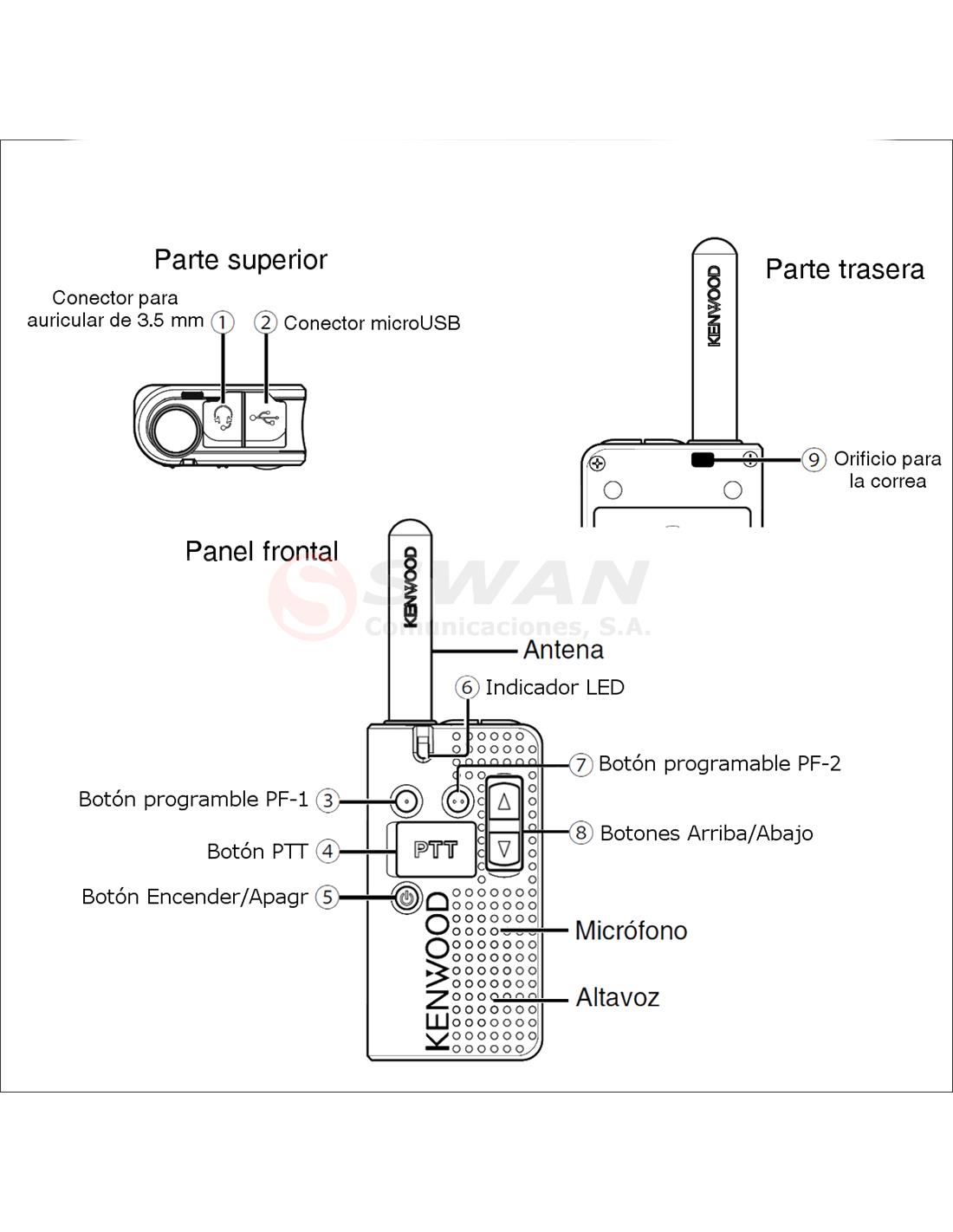 El transceptor portátil KENWOOD PKT-23 viene preparado para su uso inmediato, sin necesidad de ser programado. Además todos sus botones se encuentran en el panel frontal para un rápido acceso. En la parte superior del panel frontal tiene un LED multicolor que nos puede indicar: la transmisión de la radio, o el nivel bajo de batería, o la alerta de una llamada mediante el destello del LED y un beep.