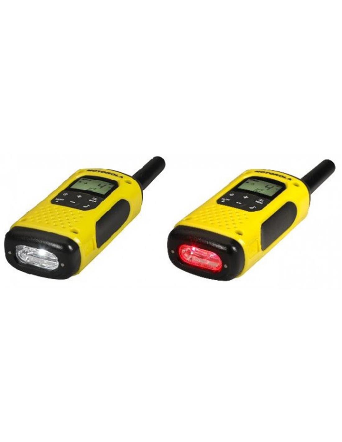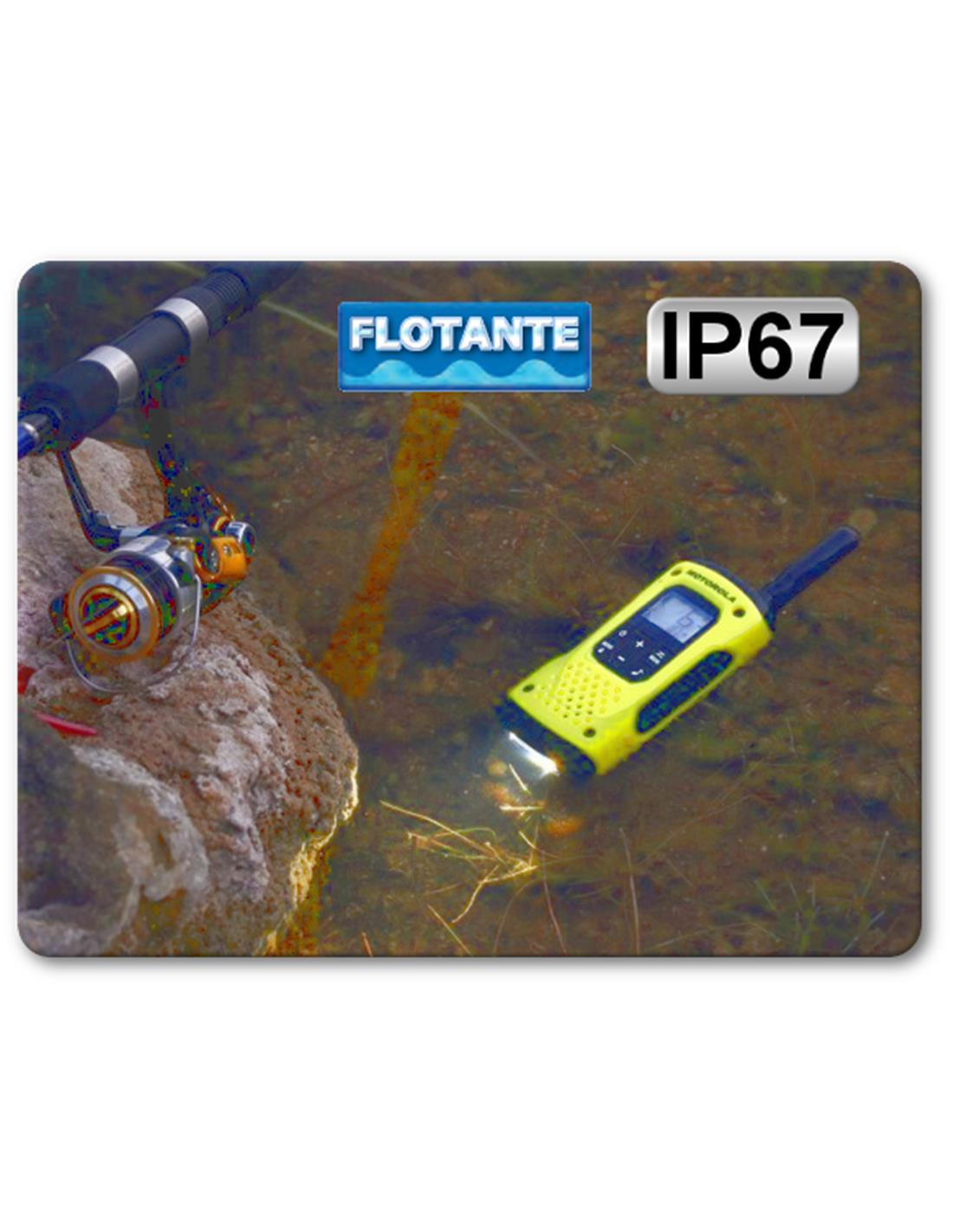 El walkie MOTOROLA T92 H2O no necesita ningún tipo de licencia para su uso. Es muy robusto y resistente, y cumple con el grado de protección contra polvo y agua IP67. Además flota y se activa automáticamente la linterna en contacto con el agua. Tiene una pantalla LCD retroilluminada y un botón naranja de emergencia.