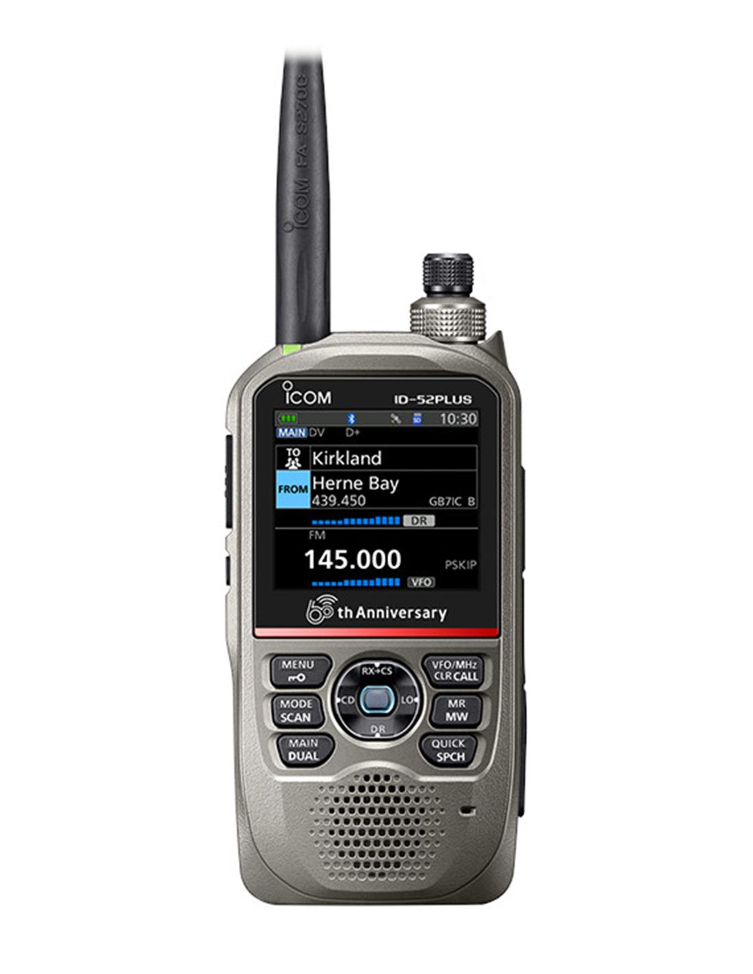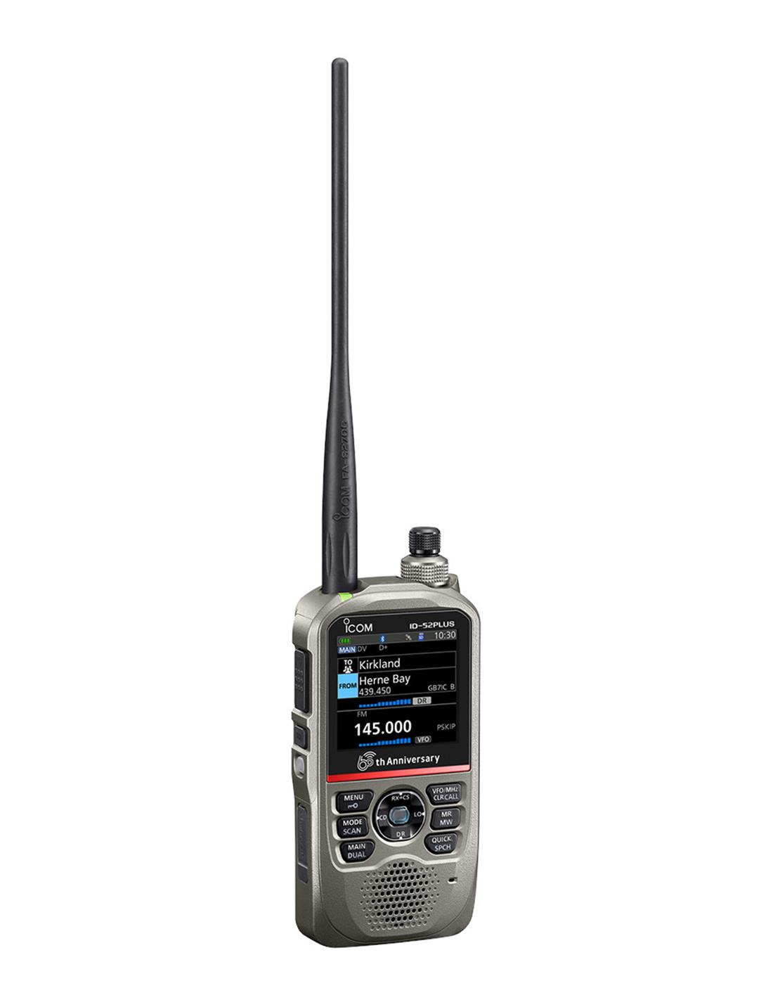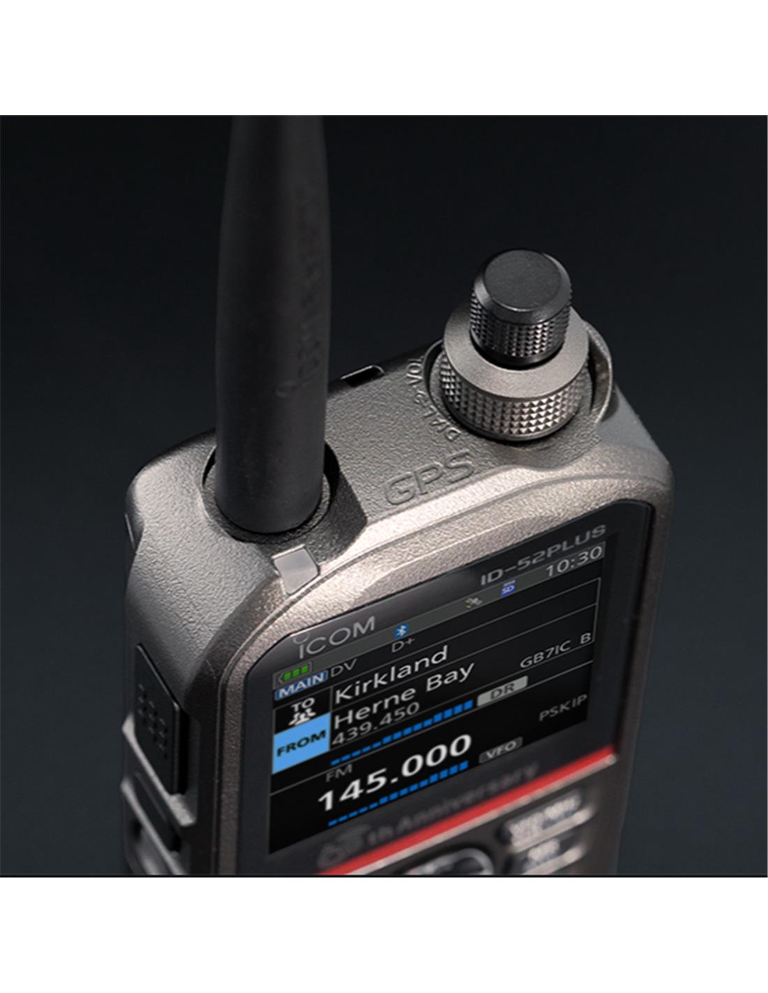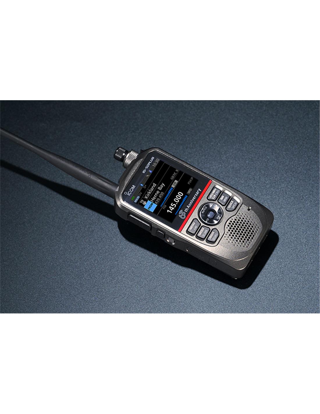 El cuerpo, incluida la perilla de volumen, presenta una pintura metálica que recuerda al titanio. Este color intenso y sofisticado resalta la singularidad del modelo del 60 aniversario. Además, la inclusión del rojo característico de la marca Icom como acento crea una impresión que es a la vez de alta calidad y dinámica.
